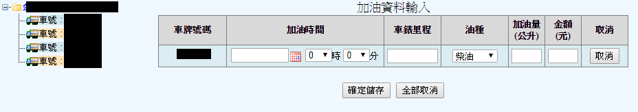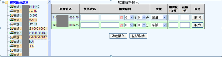 本功能中,你可以以列表方式,新增車輛的加油資料,點選左邊車輛選單後,可以新增一筆加油資料,可點選多次或多台車,同時進行資料輸入,輸入完畢後,可以全部儲存或取消單筆或多筆加油資料。 設定完成後,報表的油耗相關資料查詢(ex,車輛使用記錄),將會依照您所輸入的發票,計算油耗率,並以此油耗率進行油耗量的估算。 *如客戶需要手動輸入車錶里程,可請PM至客戶參數設定進行設定,如圖2