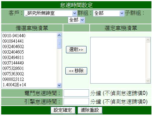 怠速時間設定如下圖,在指定「群組」與「子群組」後,可由「備選車機清單」選擇車機,填入「電門怠速時間」、「引擎怠速時間」後(以分鐘為單位,不偵測怠速時請填0), 按下「設定確定」,即完成怠速時間設定。