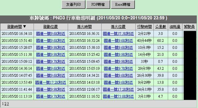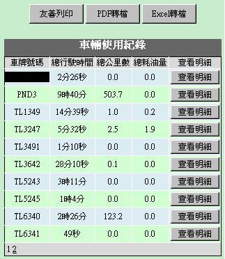 選擇一台特定車輛,點選查看明細按鈕之後,提供詳細之車輛使用紀錄資料,包含發動時間、發動位置、熄火時間、熄火位置、行駛時間、公里數、油耗量與駕駛員等資訊,如下圖。 使用者亦可按"友善列印"、"PDF轉檔"或"Excel轉檔"按鈕進行明細資料之列印工作或下載檔案。